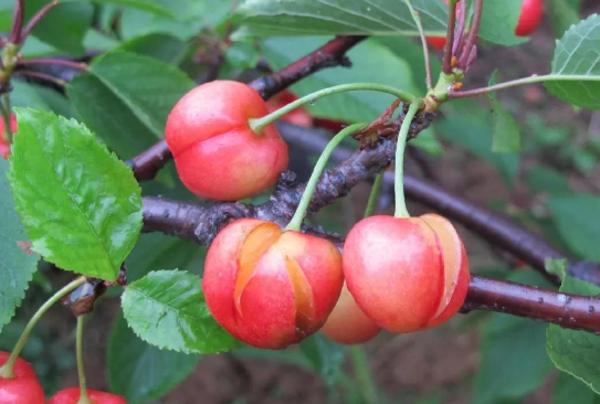 櫻桃采摘前果實(shí)表面出現(xiàn)發(fā)軟、發(fā)蔫癥狀;或出現(xiàn)水浸狀果肉(玻璃果);或出現(xiàn)豆斑病;或在果實(shí)進(jìn)入膨大期后,遇到雨水就出現(xiàn)裂果現(xiàn)象。